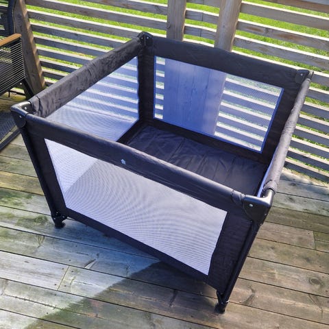 Den er 68cm høg. Den er 84cm x 84 i lengden og bredden. Leketeppet og putekant kan følge med. Platen kan stilles inn i tre ulike nivåer.