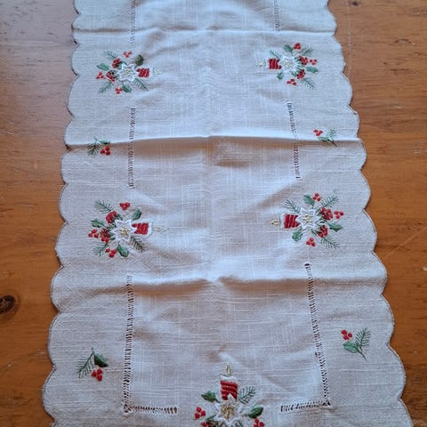 En retro juleløper, en liten julebrikker i hvitt med gulldekor og en ny jule gryteklute . Ingen av delene har vært i bruk. Samlet kr 50. for alt. Fin gave . Kan sende