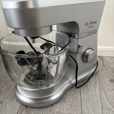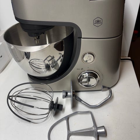 Den er kun brukt en gang, da til å rive grønnsakene og ost. Dette fungerte fint. De fleste av tilbehørene er ubrukte og fremdeles i original innpakkingen. Eske og emballasje følger med 😊.