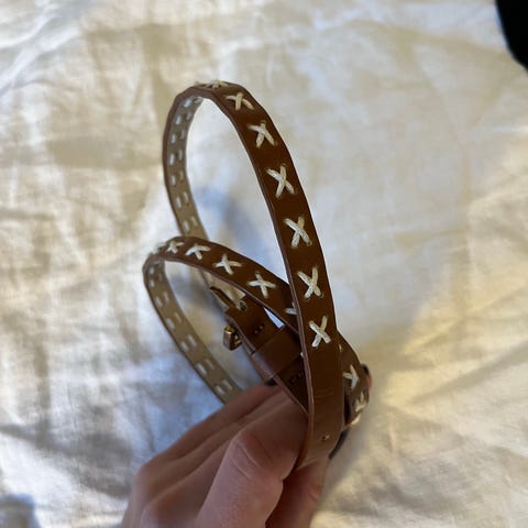 Langt skinnbelte som brukes to ganger rundt livet. Bredde 1cm. Lengde 177cm. Brukt to ganger. Naturfarget skinn.