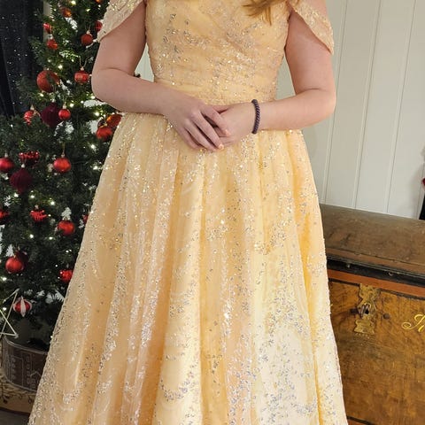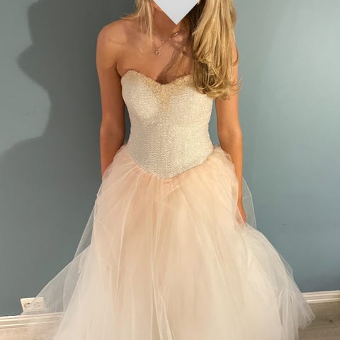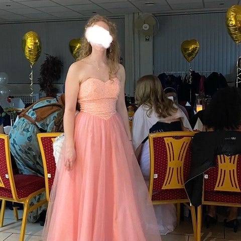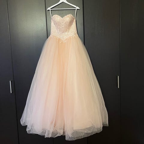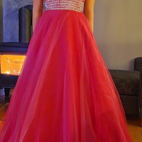 En nydelig dus rosa ballkjole, med vakre paljetter på. Denne ballkjolen er kun brukt 1 gang og har hengt i skapet siden. Størrelse 38 og skreddersydd til høyde 157cm.