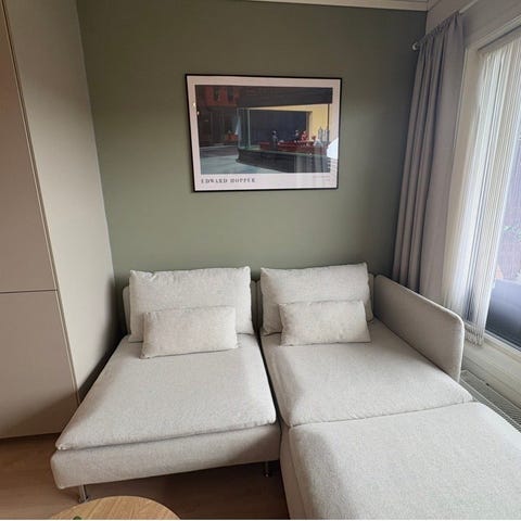 Stoffet er uten hull eller skader – kun vanlig bruksslitasje og naturlige merker i stoffet (se bilder). Sofaen er fortsatt i god og funksjonell stand.