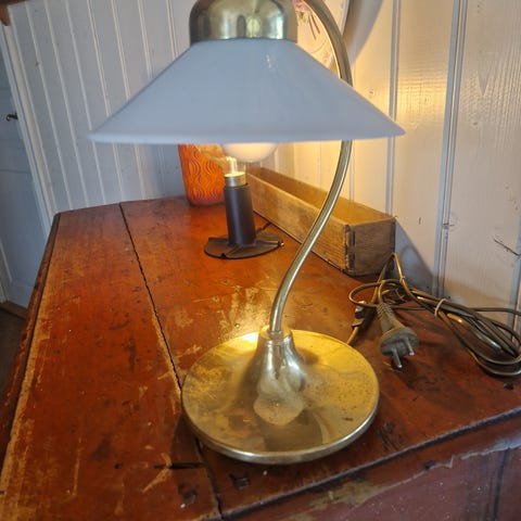 En fin liten skomakerpendel i blått glass til salgs. Lampen er hvit innvendig som reflekterer fint.