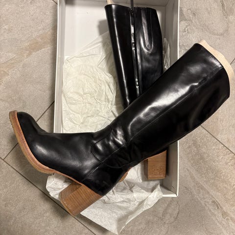 Svarte støvler i størrelse 39, laget av skinn eller lignende materiale. Støvlene har en rett skaft og lav hæl, egnet for daglig bruk.