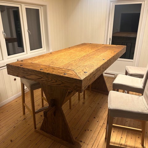 I god stand, men bordplaten har bruksmerker etter sola/duk og varm kjele, så denne bør slipes og poleres på nytt.