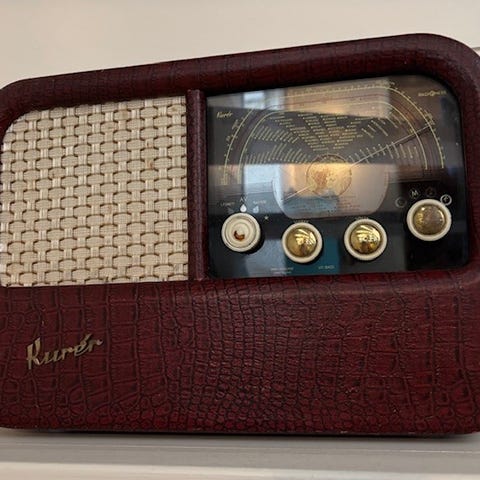 Selger en gammel Kurer Transi fra ca 1960. Den virker selv om lydgjengivelsen ikke er den helt store, og batterier følger med. En liten skade på håndtaket (se bilde).