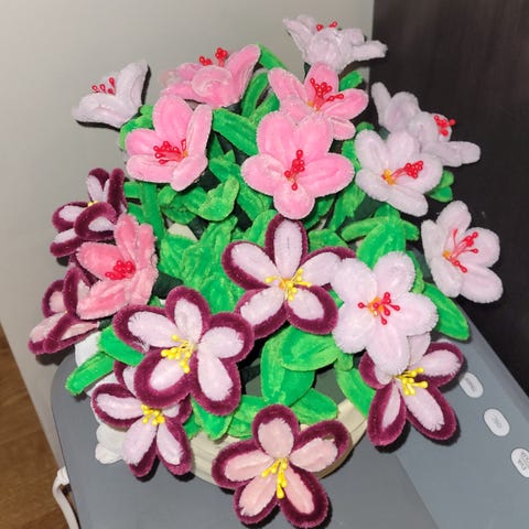 Håndlaget heklet dekorasjon formet som en blomsterpotte med blomster. Laget av bomullsgarn i flere farger inkludert rosa, blå, grå og gul. Passer som dekorasjon i hjemmet.