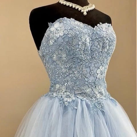 Nydelig lyseblå ballkjole med mørkeblå detaljer. Kjolen er i størrelse M, men har snøring i ryggen slik at den kan passe til en S–L. Hun på bilde er 172cm og bruker flate sko. Det følger med to innlegg til å ha i ryggen samt et sjal i samme farge. Ballkjolen har ingen bruksmerker og kun brukt 1 kveld (5 timer). Kjolen er kjøpt ny på pandoras Fevik i februar 2025.