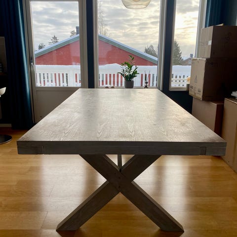 Selger spisebord fra Bohus, ventos serien. Kjempe fint bord med kun litt slitasje som en stripe og litt slitt farge noen steder. Synes lite da det er samme farge som bordet og lys/pynt vil gjemme det bort. Klaffen er kun blitt brukt en gang, som ny. (Ikke med på bildet)