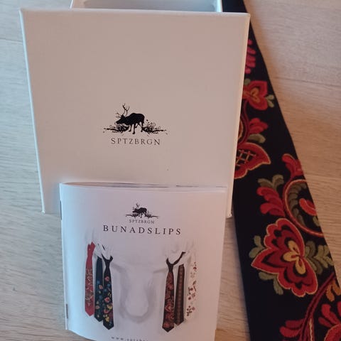 Bunadslips inspirert av meldalsbunadens broderi, maskinbrodert på kremhvit bunadsull. Broderiet har jeg hentet fra bunadens belte og stakk. Slipset er ca 165 cm langt, det er lengre enn vanlige slips, da bunadsull bygger noe når man skal knyte dobbel slipsknute. Pakkes i en pen eske for oppbevaring. Har også bunadshårbøyler i samme mønster, finnes også i sort bunadsull.