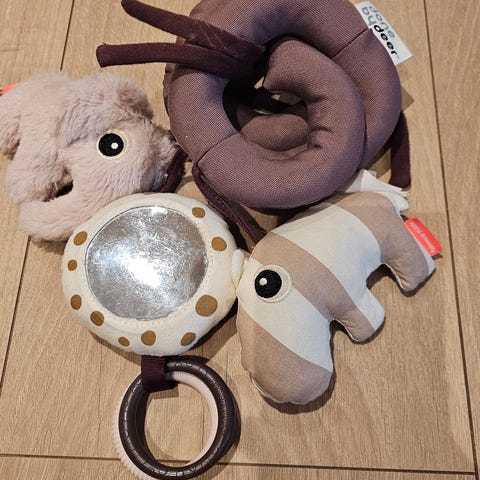 Babygym fra Tiny love. Følger med fire utbyttbare leker til å henge opp (en med musikk). Er også en gummi biteleke , blad med knatrepapir og "bånd" til å leke med fast i selve matta. Alt kan vaskes i maskina 😊