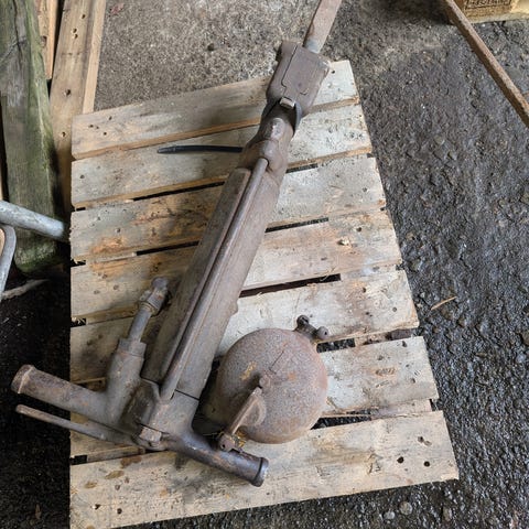 Stempel ø50mm . Slaglengde veit jeg ikke men ca 45-50cm. Har vært støttebein til en lastebil kran. Total lengde på den er 73cm. Ble påtenkt til å bruke til vedklyver i sin tid men det er ikke blitt noe av det prosjektet. Veier ca 45kg