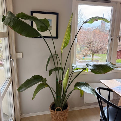 Stor og velholdt Strelitzia Nicolai ser etter et nytt hjem med mer takhøyde. Planten er ca 3 meter med tykke stilker. Kjøpt på Plantasjen i 2020. Det kommer stadig nye blader. Inkluderer en selvvanningspotte fra Lechuza (Classico Premium LS 50 White high gloss, nypris 1649kr).