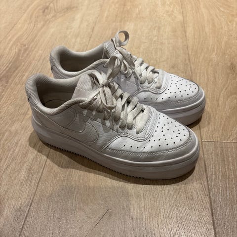 Nike Sneakers Joggesko i størrelse 36,5 for dame. Skoene har en hvit base med gullfarget logo og detaljer. Platform.