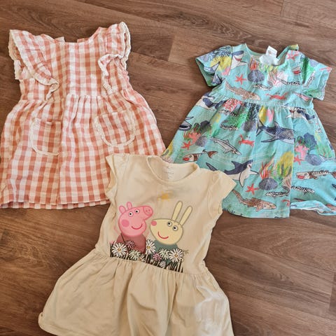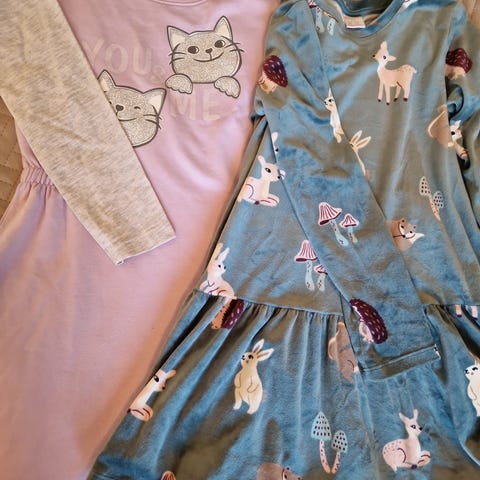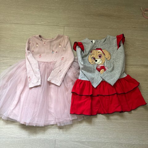 • Kjole 1: Rosa kjole med søtt Disney-motiv (Pocahontas og venner). Overdelen har små volanger på skuldrene, og skjørtet er laget av lett tyll som gir et pent og luftig uttrykk.