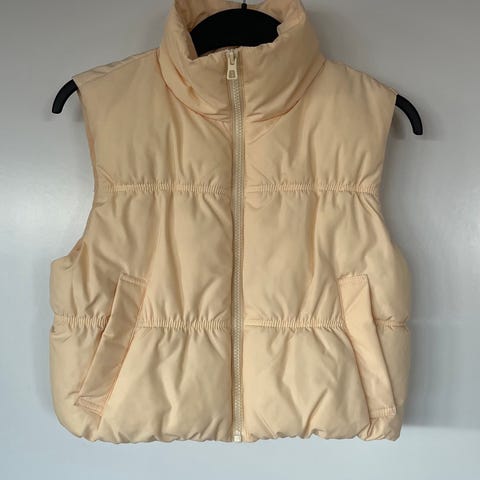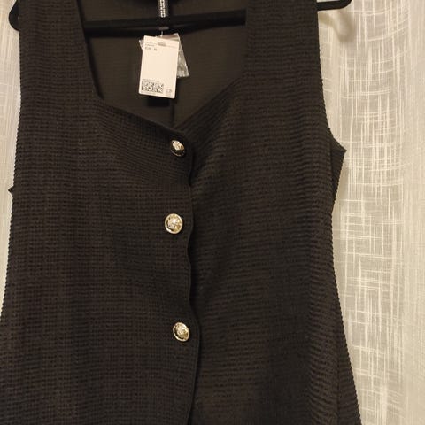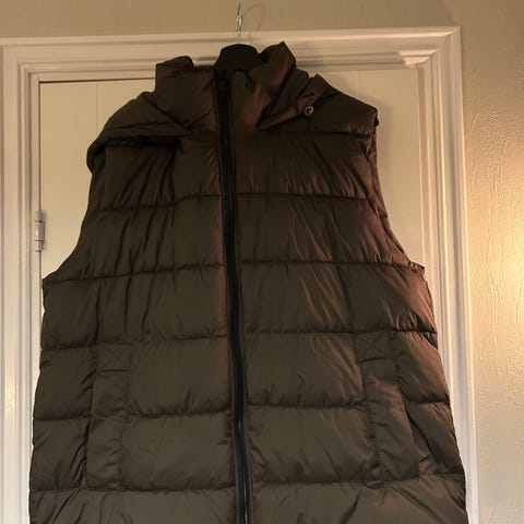 Veldig lite brukt gul boblevest, str. XL, fra Hennes og Mauritz, selges for kr.250. Fargen er litt sennepsgul, og er laget av polyester. Den har lukking med glidelås, og trykknapper, høy hals, og behagelige lommer foran. Størrelsen, og passformen er romslig, nesten litt oversized. Jeg sender gjerne, mot at kjøper betaler frakten, på kr 80. Det kan være med Helt hjem, eller Norges pakker. Vesten kan også, hentes i Østre Gausdal. Løp, og kjøp!