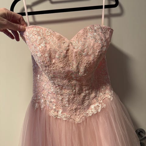 Selger en nydelig rosa ballkjole i størrelse 42. Kjolen er pent brukt og uten hull, flekker eller slitasje. Den har flotte draperinger, lag-på-lag-skjørt og perledetaljer over bryst og i midjen som gir et elegant uttrykk.