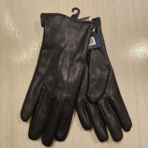 Flotte håndsydde hansker. Ikke brukt. Med lapp på. Sort skinn med lammeskinnsfor.