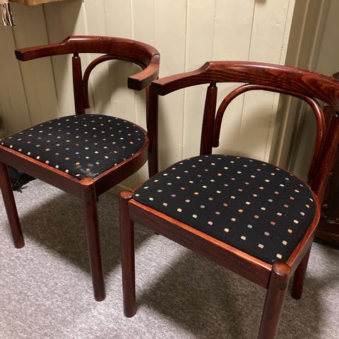 Selger to dype, pene stoler. Passer til å pynte opp inne eller på terassen. Ble kjøpt nye av forrige eier av leiligheten, så maks fem år gamle. Brukt kun til pynt av oss i 1,5 år og kun innendørs. Vi selger på grunn av plassmangel i leiligheten.