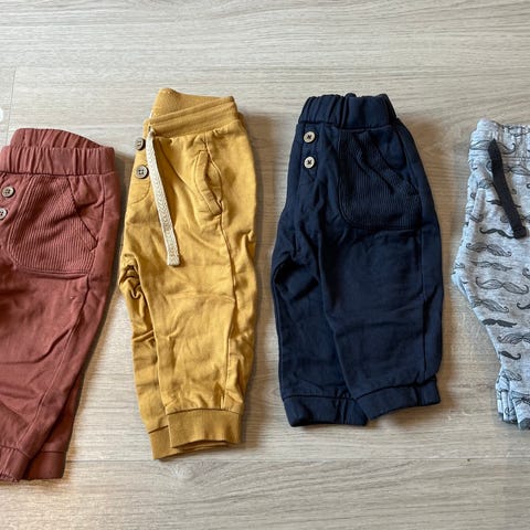 Selger en pakke med tre bukser i størrelse 74. Alle er myke, stretchy og perfekte for lek og hverdagsbruk. Ingen flekker eller slitasje.NYE