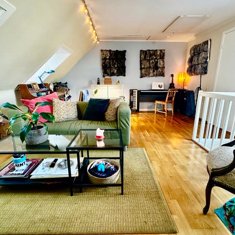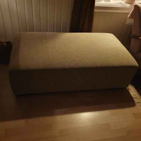 Fin grønn sofa puff som holder seg godt og har god plass inni til lagring av puter og diverse.