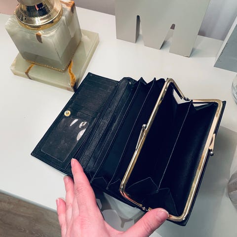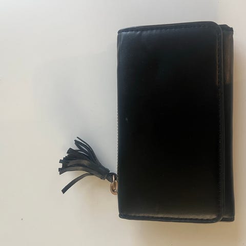 Selger en elegant og klassisk svart lommebok i veldig god stand. Lommeboken har et stilrent design, med blank svart utside og en nydelig rød innside. Den har egen dokumentdel merket “Documents” og en solid metallramme med klips for mynter.