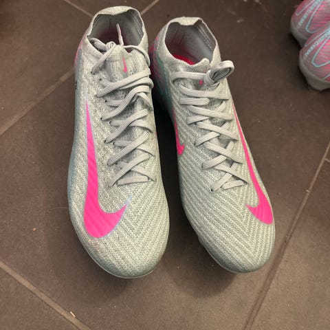 43 (US 9,5). Fargene er hvit og rød med svarte detaljer. Skoene har knotter for bruk på gressbaner.