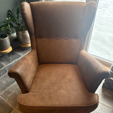 Selger to fine lene stoler med puff og bord helt sammen .Godt brukt men mye til bruke igjen .Med noen små flekker .