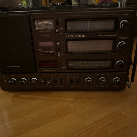 Grundig Satellit PR 940 Professional radio virker, kasset deck trenger litt reparasjon, kan rotasjone men kan ikke spille.