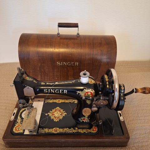 Singer Sanger symaskin med tradisjonelt design og svart metallkropp. Maskinen har dekorative gullmønstre og en håndsveiv for manuell betjening. Leveres med rød beskyttelsesveske. Passer til grunnleggende syoppgaver og reparasjoner.