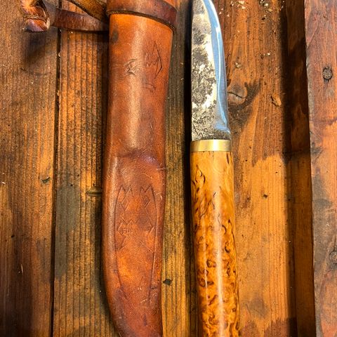 Brusletto kniv med lærslire. Ser ubrukt ut. Kniven har et blad i rustfritt stål og et skaft i bjørk. Lærsliren er svart med metallbeslag. Sliren ser ut til å ha reklame på seg Sparebanken NOR. (Se bilder) Kniven er egnet for friluftsliv og generell bruk.