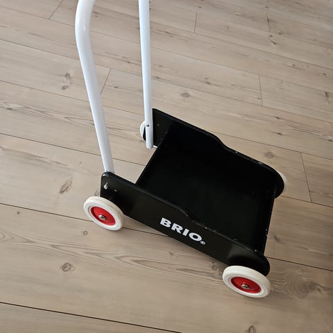 BRIO lekvogn laget i tre med rød og gul farge. Vognen har hvitt håndtak og fire hjul. Egnet for barn som begynner å gå, for å støtte balanse og motorikk.