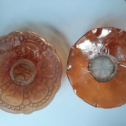 KARNEVALSGLASS. Bolle og skål/fat/underskål i pressglass/lusterglass fra 1930-tallet med ferskenfarget lusterdekor, i rik relieff. Begge i utrolig fin stand, uten skader og uten synlig slitasje, veldig blanke og fine. Størrelse skål/bolle Ø: 11,5 cm, H: 5 cm. Størrelse fat Ø: 14 cm, H: 2 cm. Selges samlet for 250kr. Kan sendes, frakten kommer i tillegg (70kr med PostNord eller 80kr med Posten), pakker godt, sender i løpet av 2 dager.