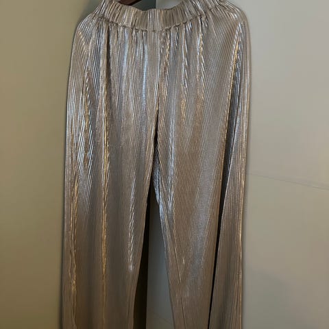 RESERVERT Kule sølvbukser i str 40. Kjøpt her på Tise, kun brukt en gang av forrige eier. Kun prøvd på av meg. Fine til julebord eller nyttårsaften! Behagelige på.