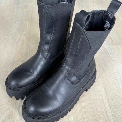 Kule Steve Madden boots. Skoene er laget av skinn, og har snøring foran og glidelås på innsiden for enkel påkledning.