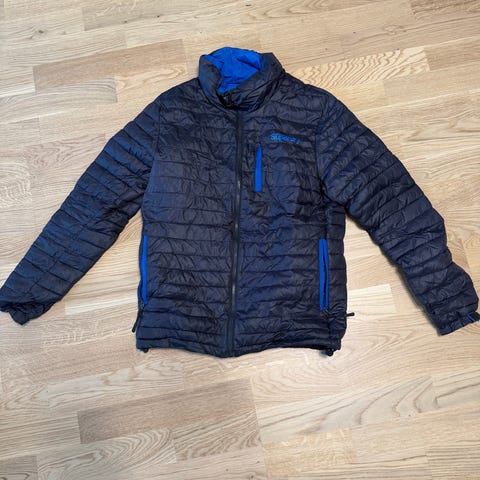 Jean Paul Jakke for herre i størrelse L. Jakken er blå og laget av polyester. Den er en utendørsjakke med dunfyll, designet for å gi varme og beskyttelse i kaldt vær. Jakken har glidelåslommer og instruksjoner for vedlikehold som inkluderer vask ved lav temperatur og unngå tøymykner.