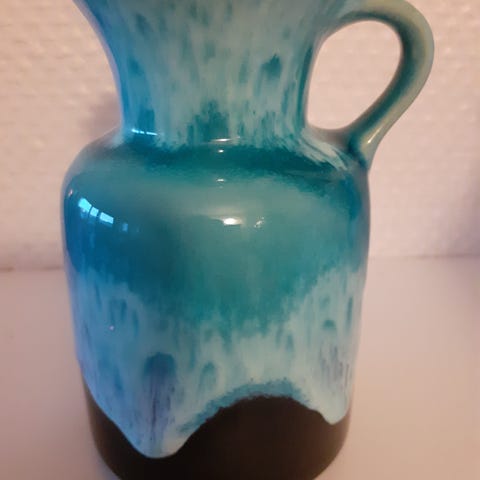 'Vakker vase/mugge og skål på fot frå Heliopora-serien til Kosta Boda. Skåla er 19 cm høg og har diameter på 25,5 cm. Vasen er 33 cm høg, diameter 11, åpning 7,5 cm.
