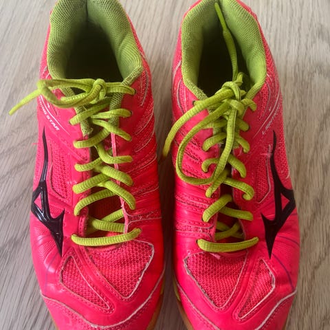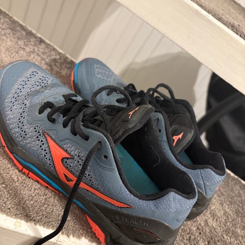 Mizuno Wave Stealth hallsko i blå og rød farge, opprinnelig designet for dame, men er brukt til barn (gym) en meget kort periode.