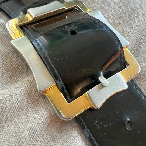 Tøft og stilig lakkbelte m stil. Belte har borrelås og festes m det.