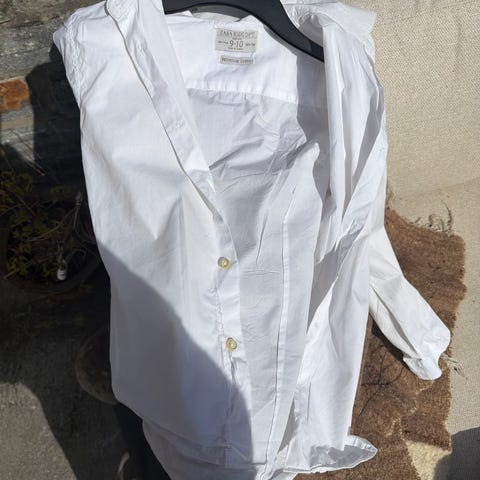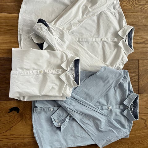 En blå med dobbelkrage som detalj, en klassisk hvit og en hvit med shine hvite striper med mandarin-krage.