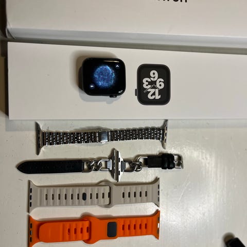 Apple Watch SE (modell MNQC3DH/A), 40 mm aluminiumskasse i sølv med Nike Sport Band i Summit White/Black. Klokka er godt brukt, og har noen riper i glasset – se bilde i annonsen for detaljer. Elles fungerer den helt fint. Ripene er lite synlig under bruk med skjermen på. Har også lagt på skjermbeskyttelse, så ripene kjennes ikke, men er noe synlige.
