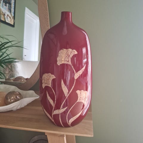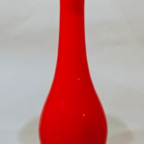 To røde glassvaser med høy og smal form. Flott rødt farget glass. Passer perfekt til dekorasjon eller blomsterarrangementer.