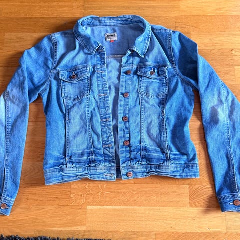 ONLY dongerijakke for dame i størrelse L. Jakken er laget i lys blå denim med klassisk krage, knappelukking foran og brystlommer med klaff og knapp. Lange ermer med mansjettknapper og justerbar hempe nederst bak. Egnet som ytterlag i mildt vær eller som et lag over topper og kjoler. Liten i størrelsen. Eventuelle merker eller bruksspor fremgår av bildene.