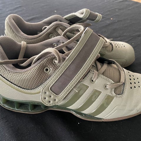 Adidas Powerlift treningssko i størrelse 40. Skoene er grå med en kombinasjon av materialer som gir støtte og komfort. Designet for fitness og styrketrening med borrelås og snøring for god tilpasning.