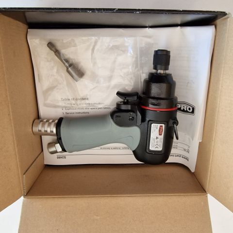 Atlas Copco BSM 10 L luftdrevet drill med pistolgrep. Verktøyet har metall chuck og lufttilkobling. Brukt til bore- og skruearbeid i ulike materialer.