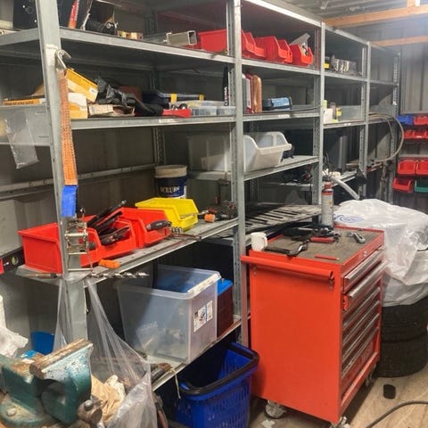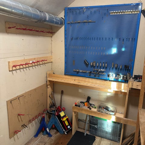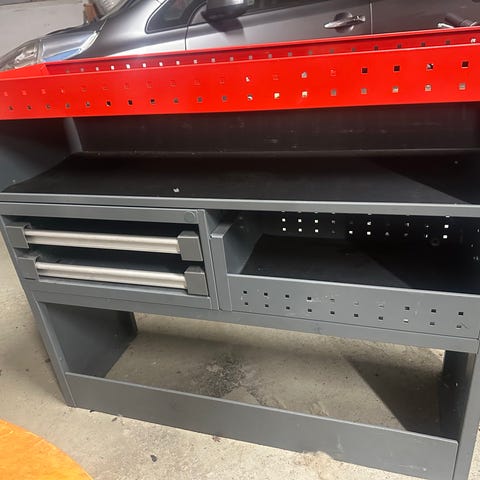 Solid og robust arbeidsbenk i stål. Veggmontert. Godt brukt og veldig malingsslitt, men fortsatt god som ny. Skuffe til oppbevaring samt hylle under benk for mer lagring. Selges pga omorganisering.
