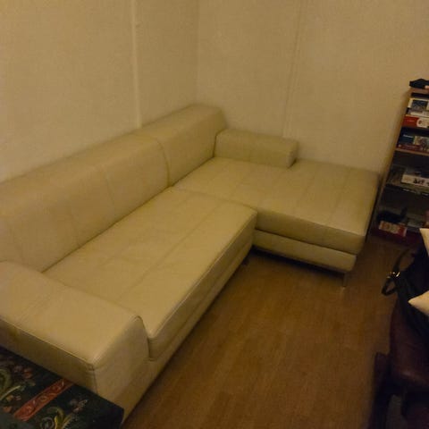 Sort skinnsofa, to-seter, fra IKEA. Muligens av typen Arild. Godt brukt. Kan nok ha godt av å strammes litt under.