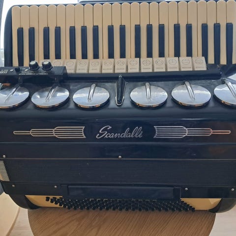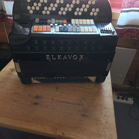 Ekko håndtrekkspill med rødt perlemorsmønster selges. Koffert for oppbevaring følger med.