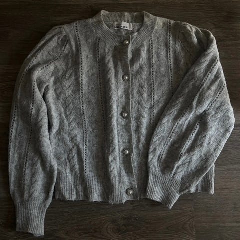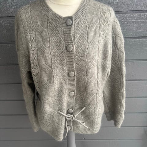 Gotland Knit Cardigan" fra Camilla Pihl. Nydelig kabelstrikket cardigan i en dus lys grønn farge. Genseren har en avslappet og komfortabel passform med v-utringning og statementknapper i front. Den har lange ermer med drop-shoulders.