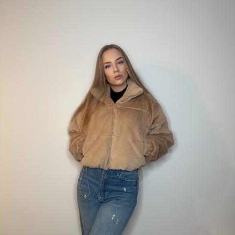 Uspesifisert Annet yttertøy i brun farge, størrelse xs/s ( som M)for damer. Jakken har et mykt, pelslignende materiale og er designet for utendørs bruk.